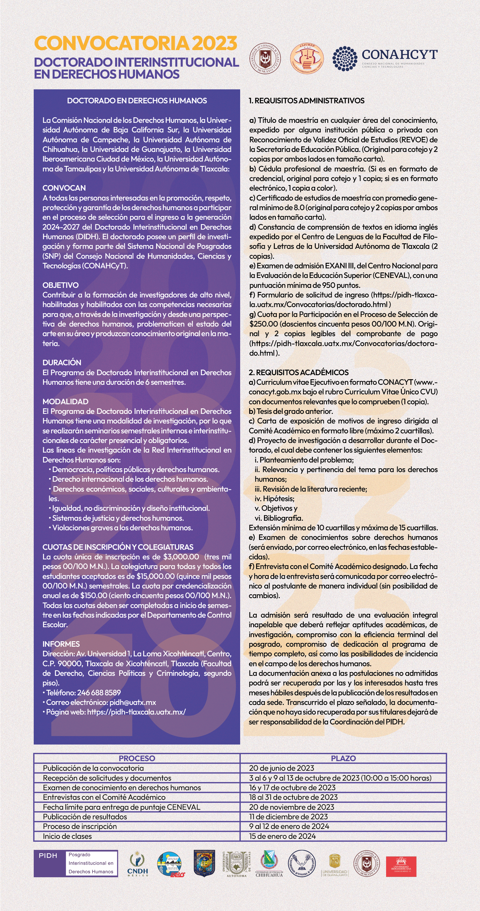 El programa académico del Doctorado Interinstitucional en Derechos Humanos es generacional, por tanto, la convocatoria para ingresar al programa se publica cada 3 años.